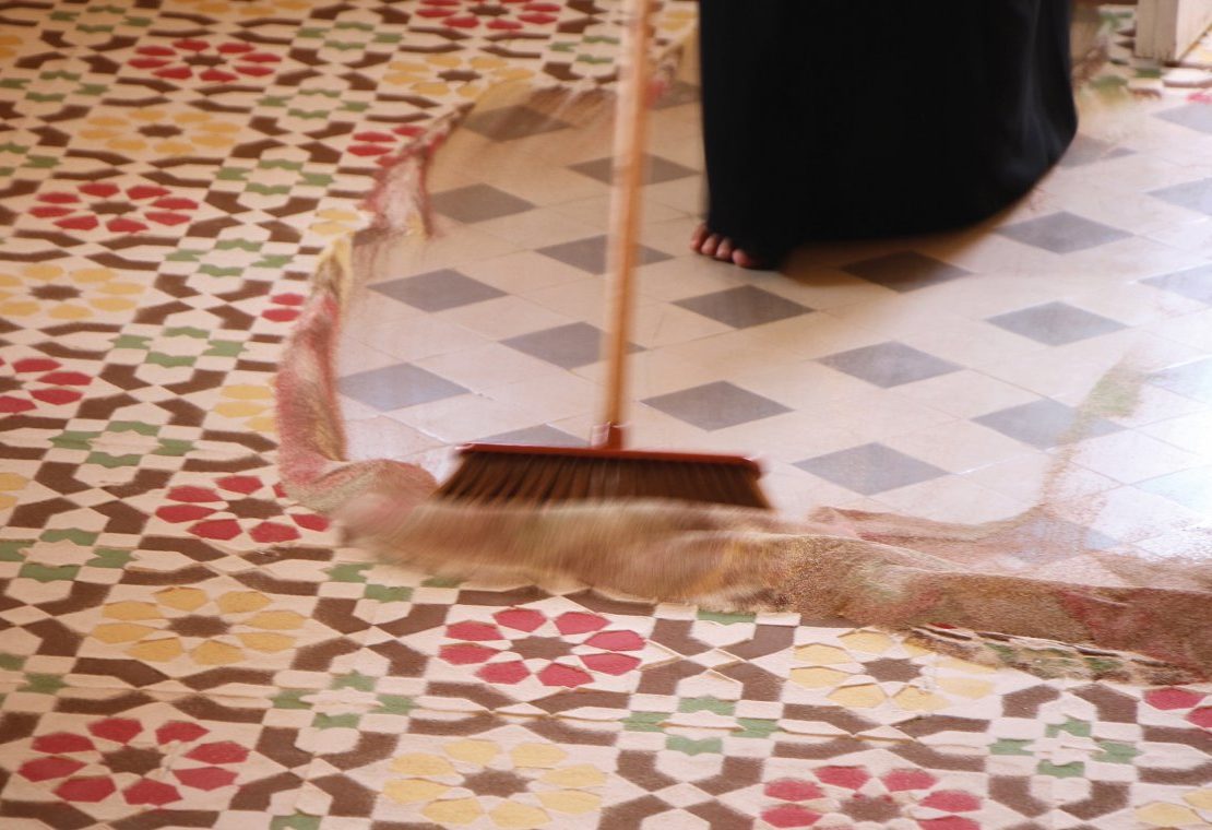 Dana Awartani is a Palestinian-Saudi contemporary Islamic artist who studied at Central St. Martins and The Prince’s School of Traditional Arts. She has created a film showing what appears to be a traditional Islamic mosaic floor in an abandoned house. The patterned tiles are in fact dyed sand that has been intricately arranged using stencils, and the film shows Dana sweeping the sand away to reveal a plain black and white floor beneath.